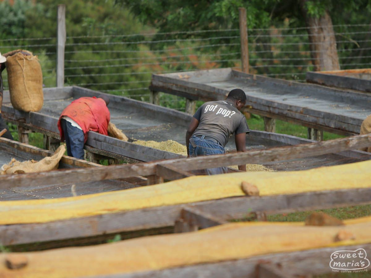 The Mahiga Factory washing station sits at 1800 meters in the Othaya constituency of Nyeri County. With just over 500 farmer members, Mahiga collects and processes the whole coffee cherry for farmer members using a disc depulping machine before fermenting the coffee in order to remove the sticky demucilage layer. After the fruit is removed, the coffee is then soaked in clean water where they are completely "washed" of any remaining fruit residue, and then dried on raised coffee drying beds. Farmers in the region grow mainly SL-28 and SL-34, with small amounts of Ruiru mixed in. Mahiga is one of several coffees we picked up from Othaya Farmers Cooperative Society (FCS), an FCS that includes an impressive amount of wet mills, 18 in all, and their work in the region dates back to the late 1950s. Coffee is processed and kept separate by process batch at the factory in order to identify quality. (See our video on Kenya processing, here). The separated batches are then run through screens in order to separate beans by size, the most common being AA (17-19 screen), AB (15-17 screen), and Peaberry, all of which are referred to as "out-turns". This is the Peaberry outturn, a natural mutation that occurs where only 1 of 2 coffee seeds inside the coffee cherry germinates, causing it to take on a small, round shape like the cherry itself. We found it to have more of a delicate fruited side than the other lots we tasted from this station.